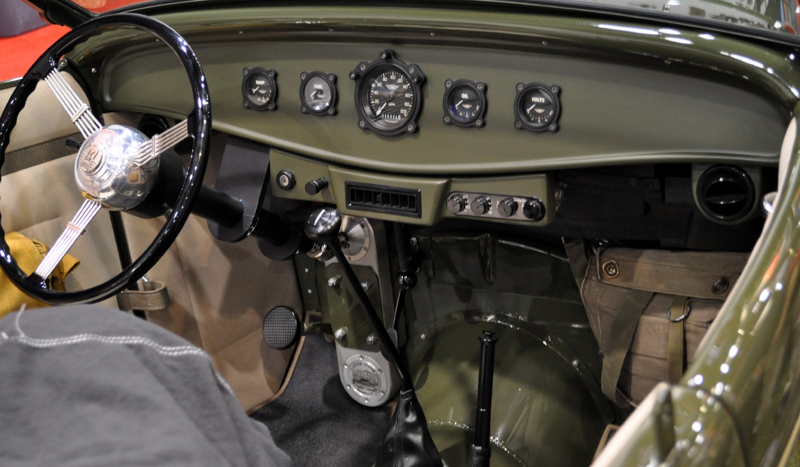 Awesome military interior pieces, the ammo can for an armrest, the canvas courier bags for door pockets, duffel bag in the passenger footwell, and the gauges are superior to any I've seen that try for the military look, but go too far and use aircraft gauges. These are perfect... they have the look, and function, that people have tried for, but failed to achieve